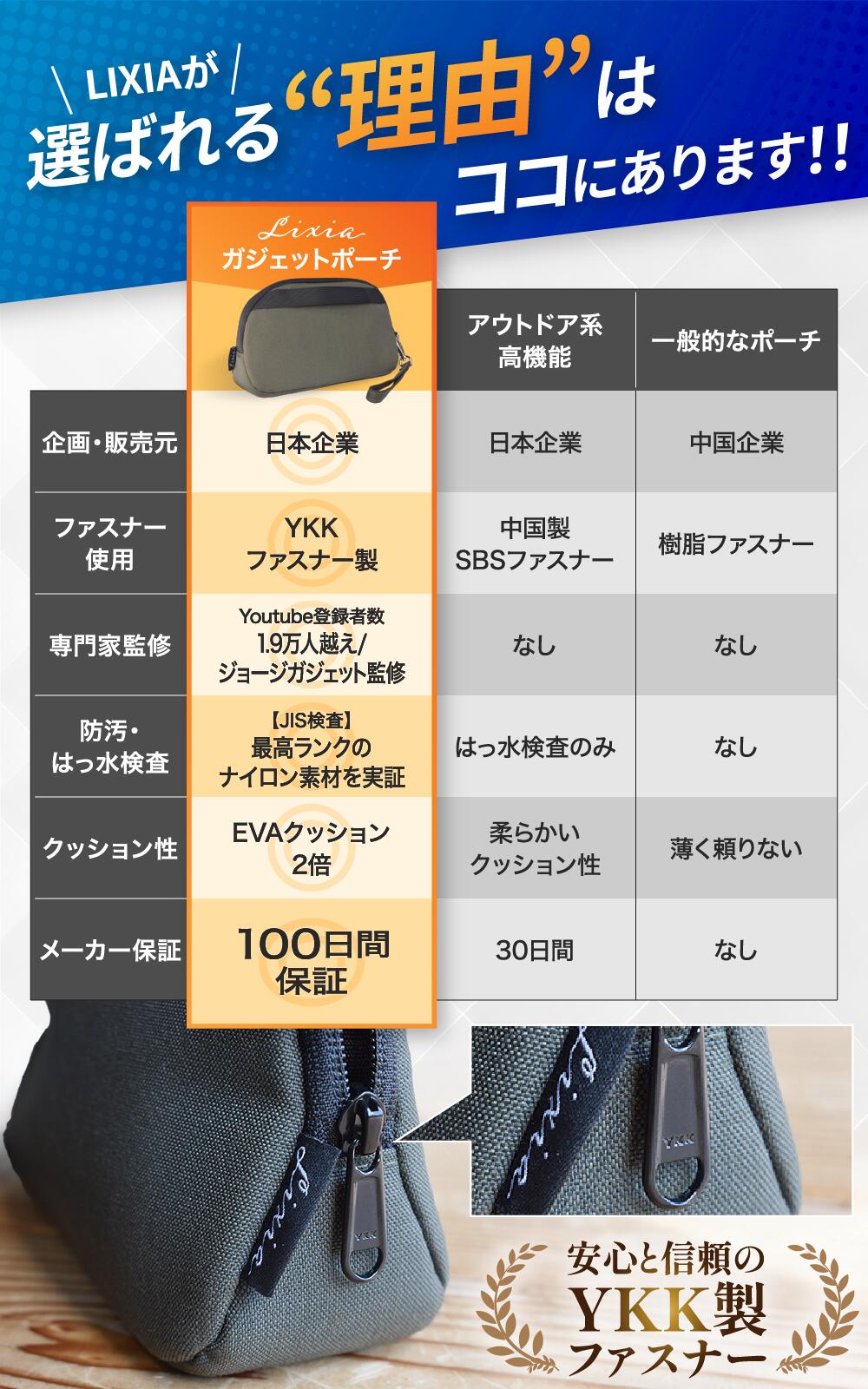 開閉が多いガジェットポーチだからこそ、壊れにくく滑らかに動くYKK製ファスナーを採用。長く愛用できる耐久性と操作性を実現しました。