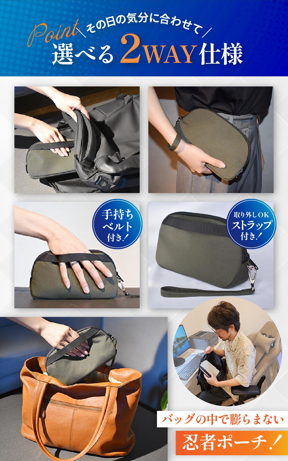 ガバッと大きく開いて中身が一目で確認。倒れにくい自立構造で、デスクでもペン立てのように「見せる収納」が可能。バッグの中ではスリムに収まり、“忍者ポーチ”としてスマートに持ち運べます。