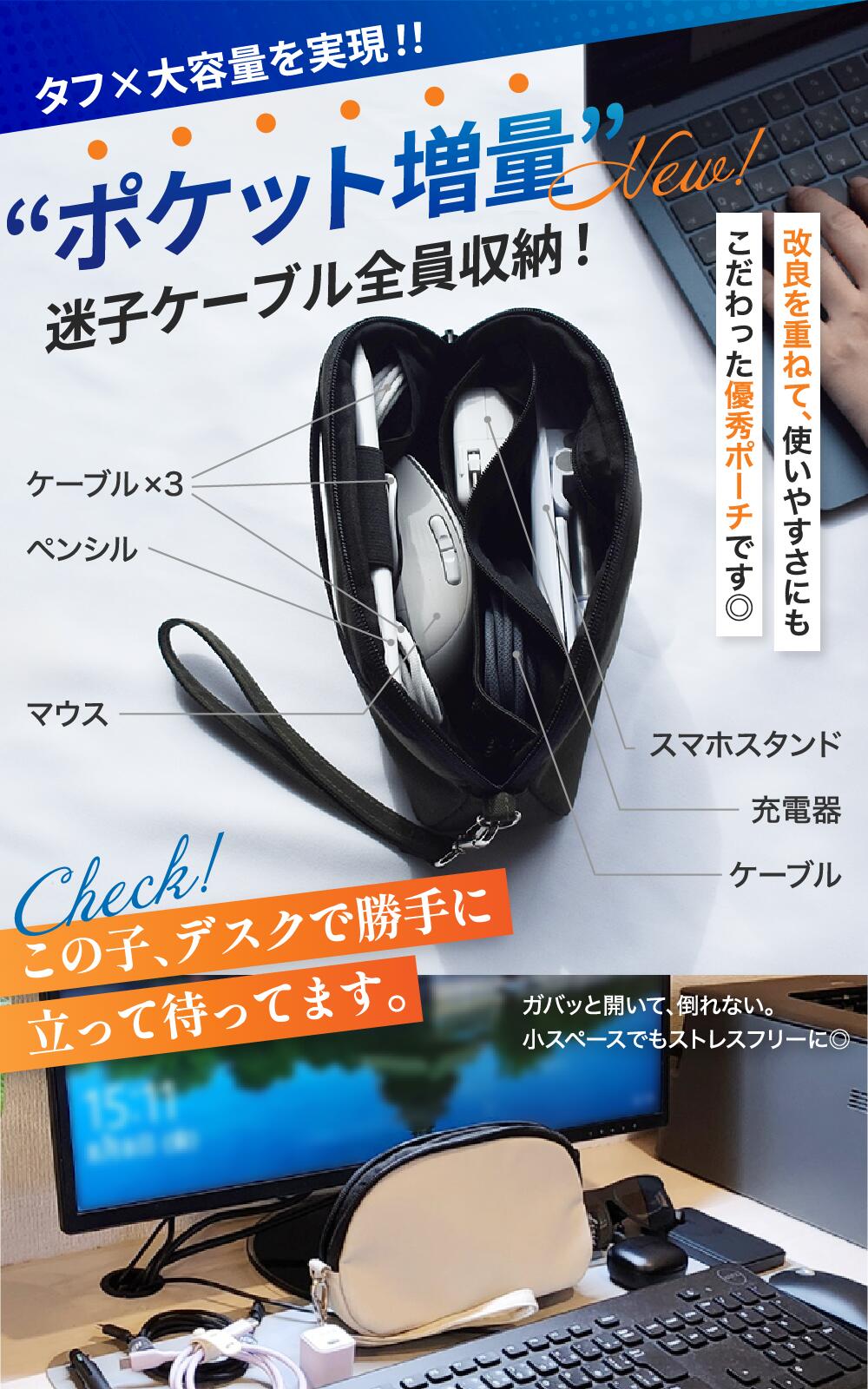 複数のポケットを配置し、ケーブル・USB・ペン・モバイルバッテリーなどをスッキリ整理。ポーチ内のごちゃつきを解消し、作業効率もアップ。