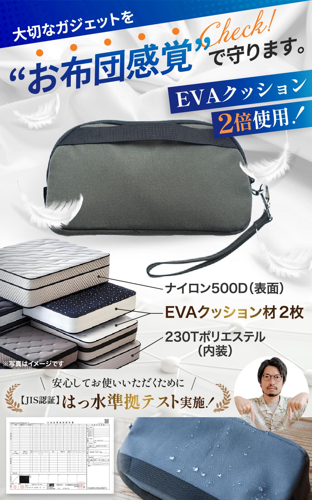 高級マットレスにも使用されるEVA素材を一般的なポーチの約2倍使用。モバイルバッテリーやイヤホン、マウスなど大切な電子機器を衝撃からしっかり保護します。
