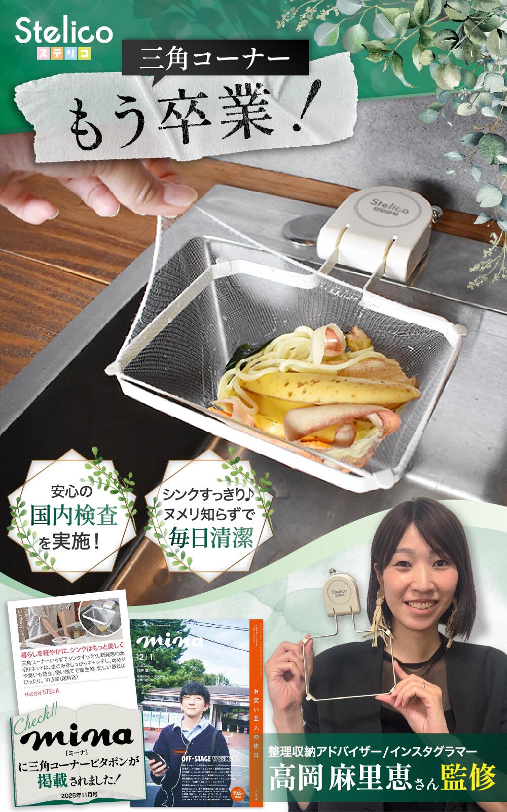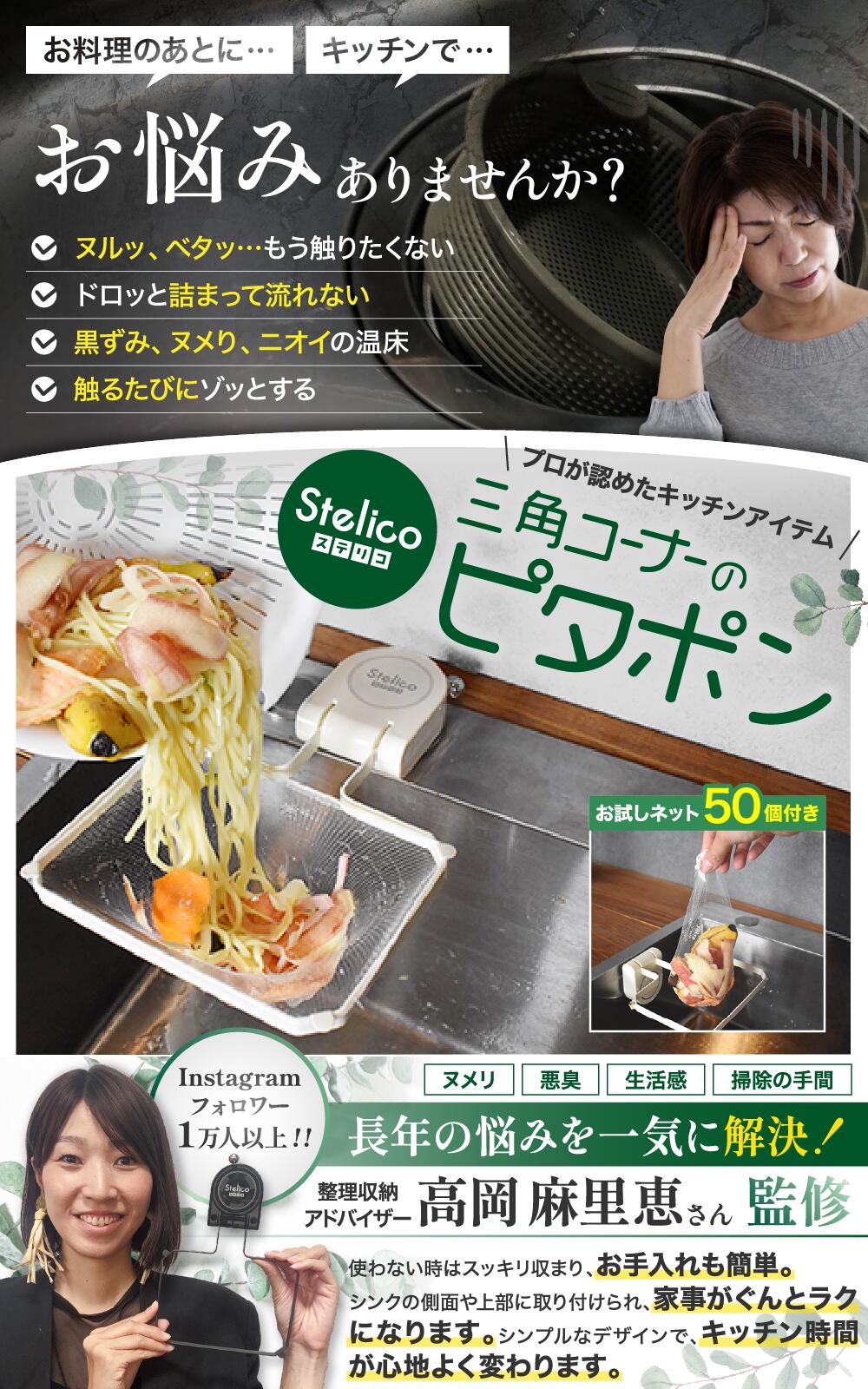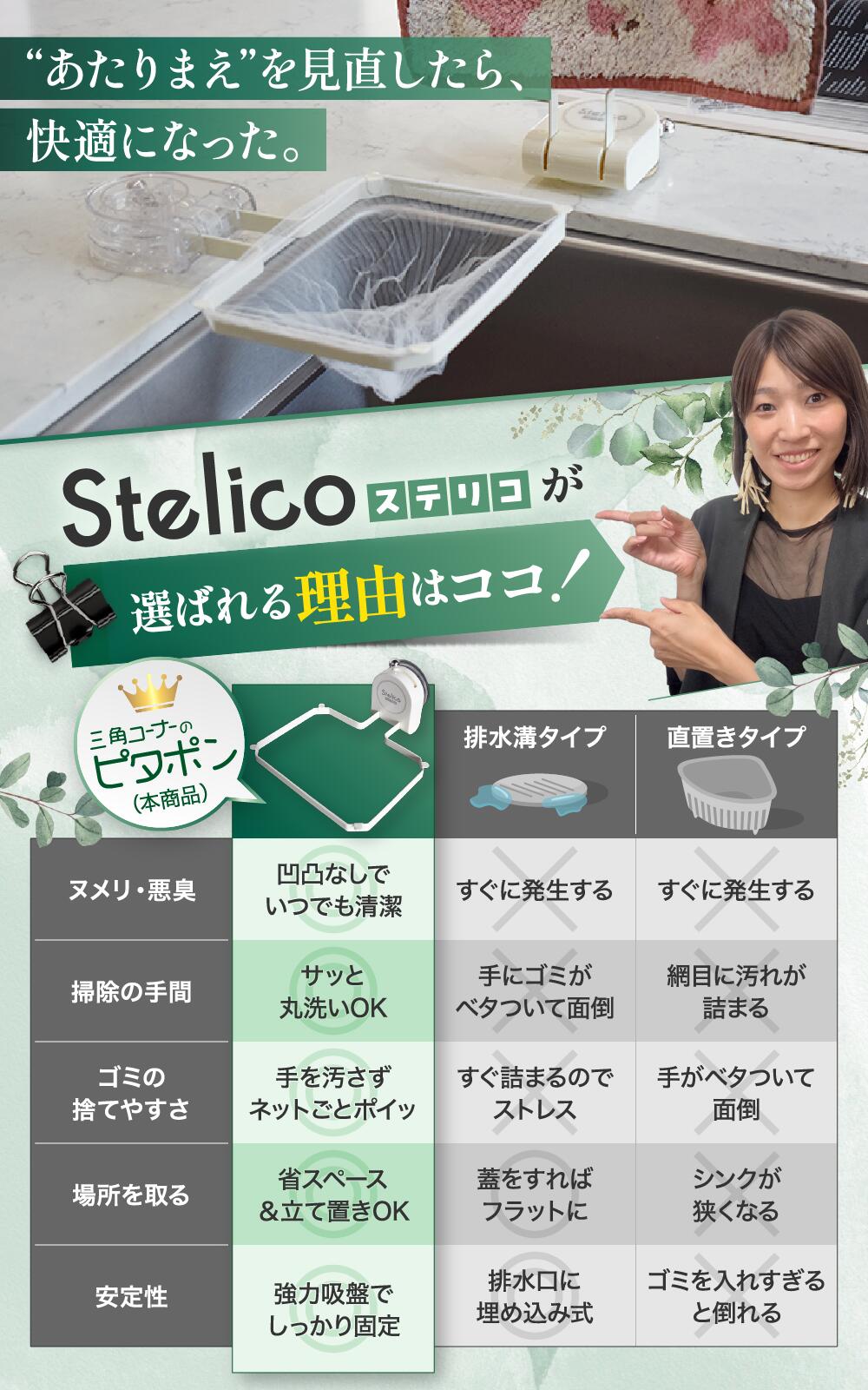 Stelico「ピタポン」は、三角コーナーいらずで使える生ゴミ水切りホルダーです。シンク内に浮かせて設置できるため、場所を取らず、調理中に出る生ゴミをそのまま水切りしながら一時置きできます。ネットを掛けて使えるので、後処理も簡単。三角コーナーのぬめりや掃除の手間から解放されます。