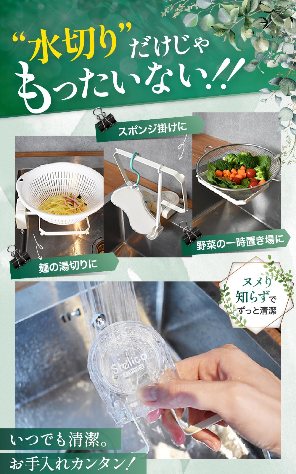素材には鉄+PETを採用し、錆びにくく水回りでも安心。耐荷重約3.5kgのしっかり設計で、日々の料理でも安定して使えます。使わない時は折りたたんでコンパクトに収納可能。シンク周りをすっきり保ちたい方に最適です。