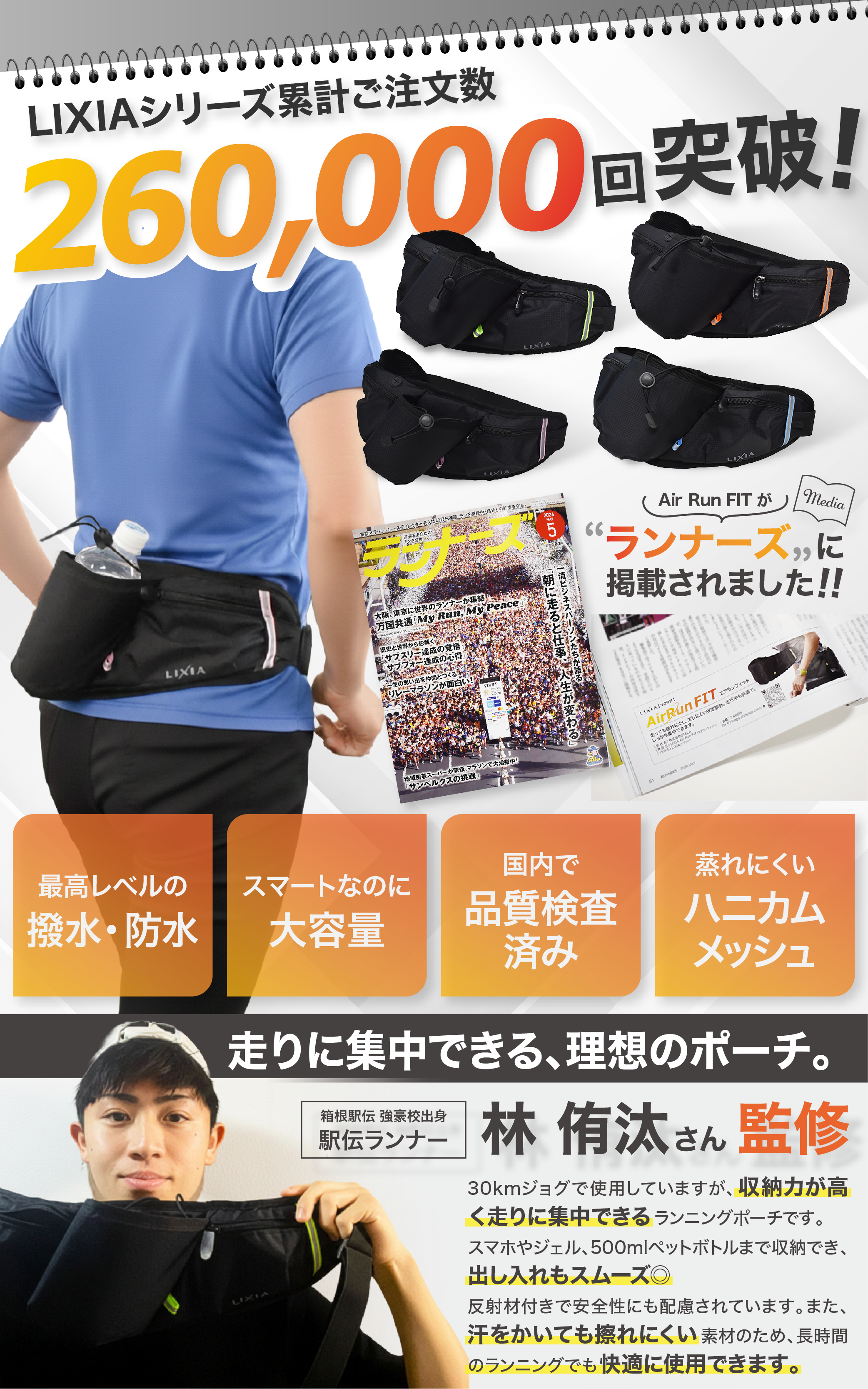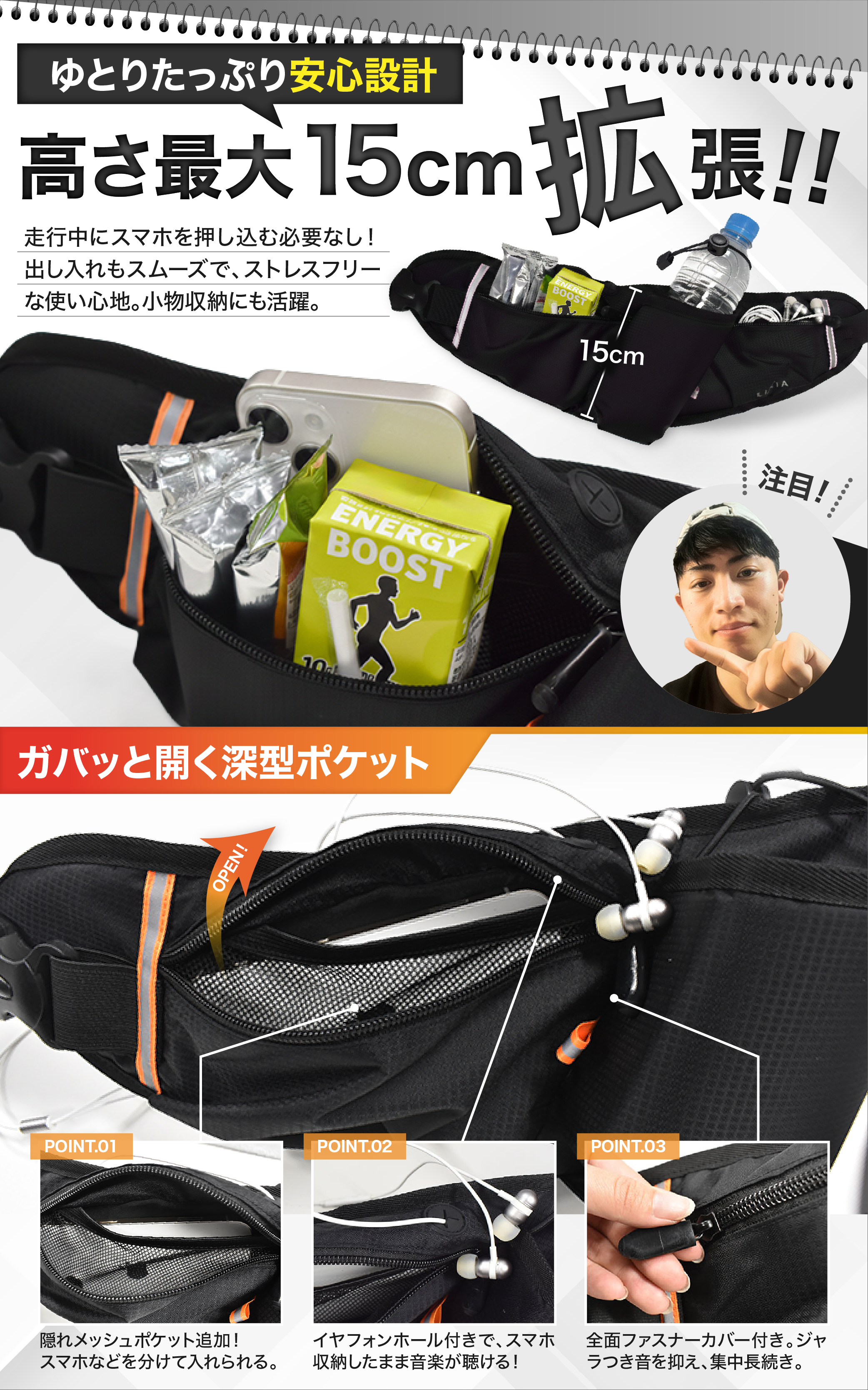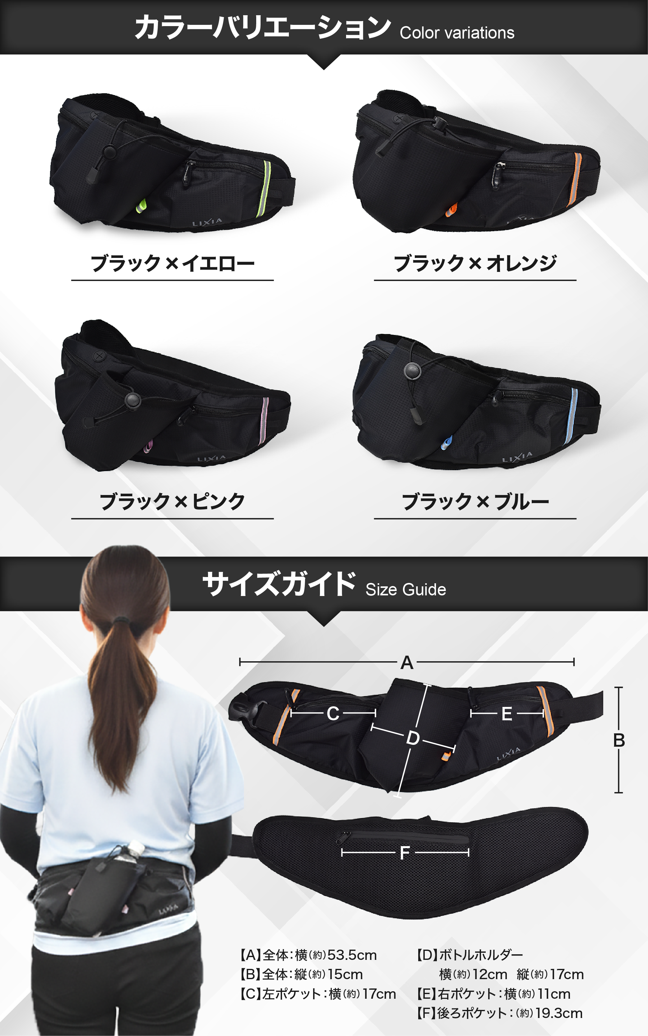 伸縮素材で体にフィットし、走っても揺れない設計。ボトルホルダー付きで水分補給もスムーズに行えます。ランニングバッグとしての機能性を追求しました。