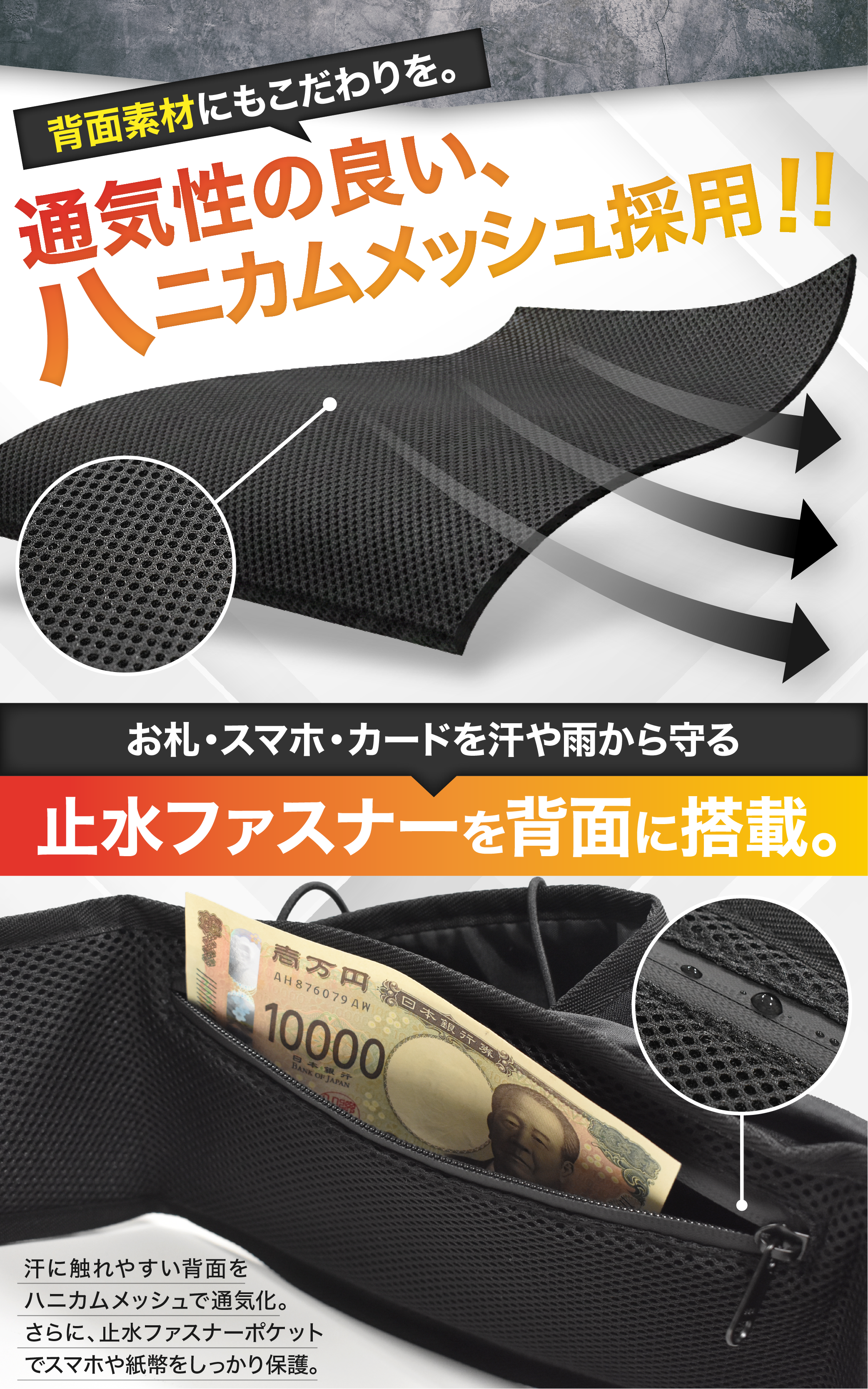 約90gの軽量設計で長時間のランニングでも負担を軽減。撥水素材を使用し、汗や雨から中身を守ります。スマホ・鍵・カードなどをしっかり収納可能です。