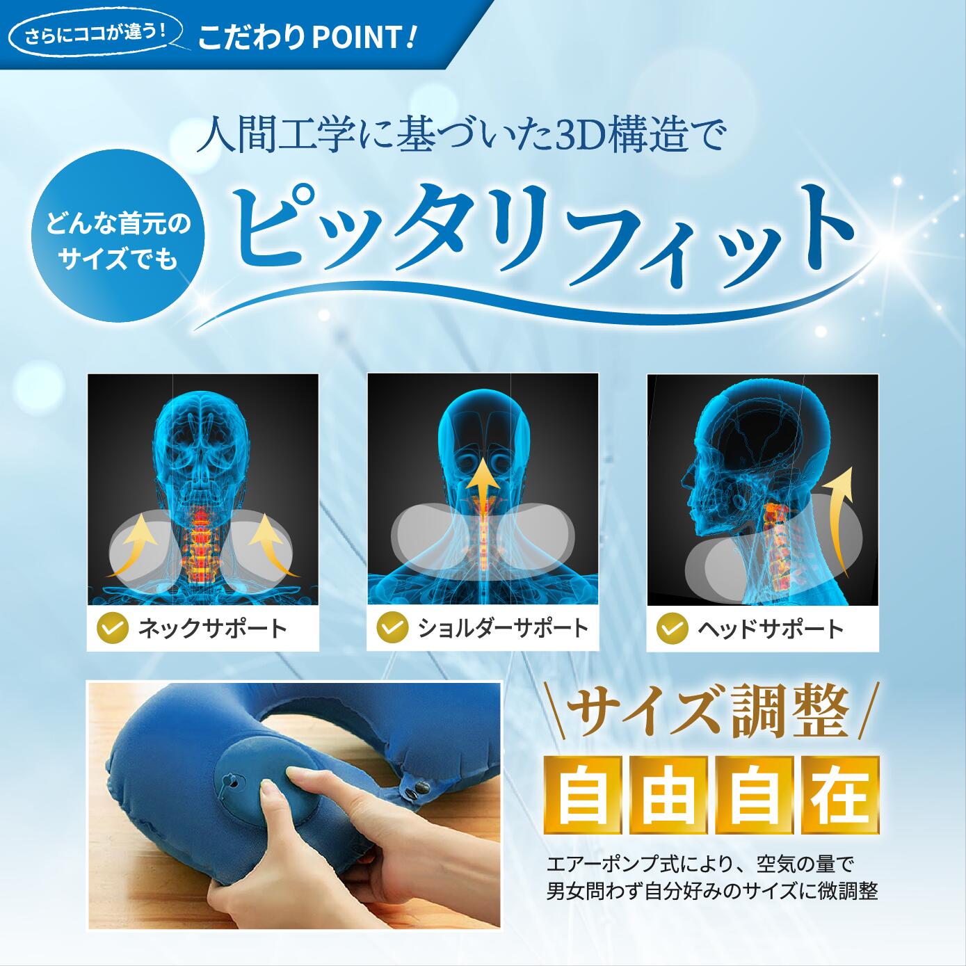 【口をつけずに膨らむ。80gの快適さを持ち運ぶ】 LIXIA「Air Nest(エアネスト)」は、本体一体型ポンプで膨らませるエアー式ネックピロー。口をつけずに使えるため、移動中も清潔で快適です。空気量を調節すれば、好みの硬さに微調整でき、長時間の移動でも首や肩をやさしく支えます。 動かせるヘッドレスト付きで、首だけでなく頭までしっかりホールド。裏表リバーシブル仕様でフィット感も調整可能です。素材にはナイロン+TPUに、上質なミルク繊維生地を採用し、肌触りと耐久性を両立。重さはわずか80g、収納時は手のひらサイズになり、付属の収納袋でスマートに携帯できます。 飛行機・新幹線・夜行バス・車中泊・オフィス仮眠まで幅広く活躍。首枕の不快感や衛生面が気になる方にも配慮した設計のトラベルグッズです。