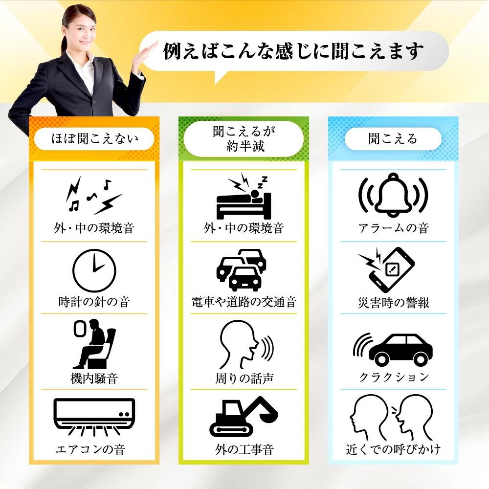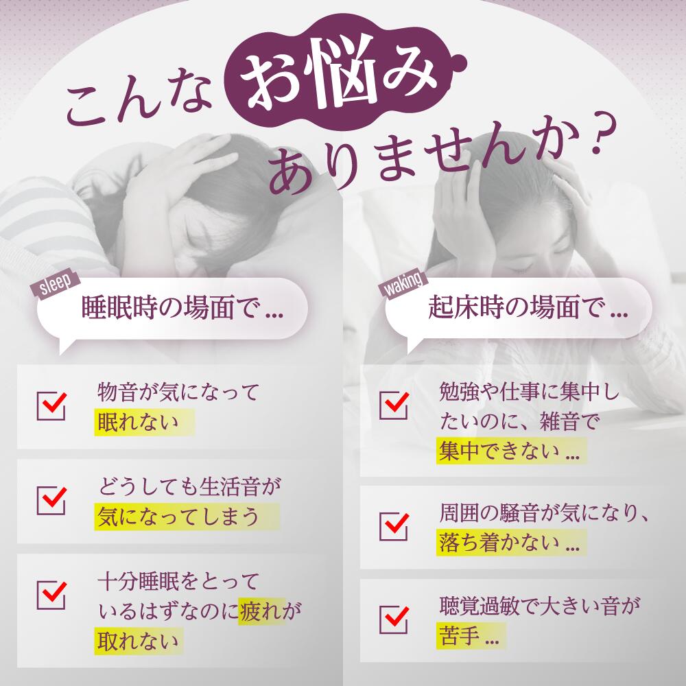 【こんな方にオススメです!】睡眠の質を向上させたい方、雑音を低減して安眠したい方、勉強・仕事に集中したい方、ライブなどの大音量の環境から耳を保護したい方、聴覚過敏・ミソフォニアの方にもオススメです。