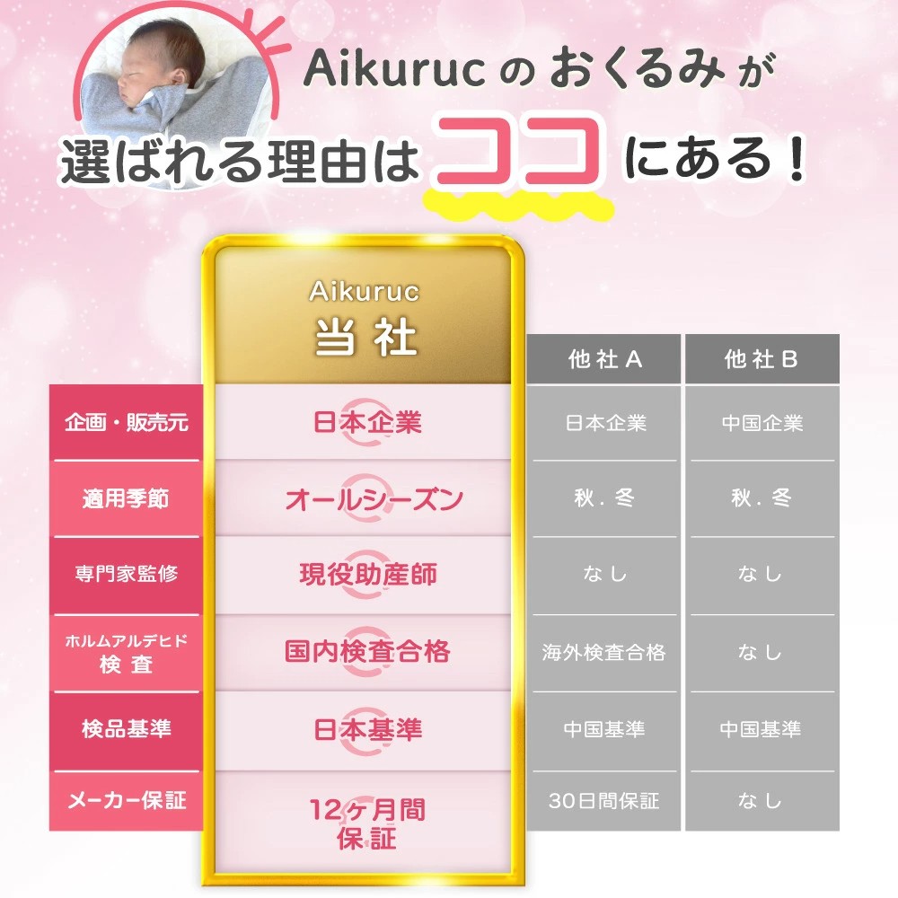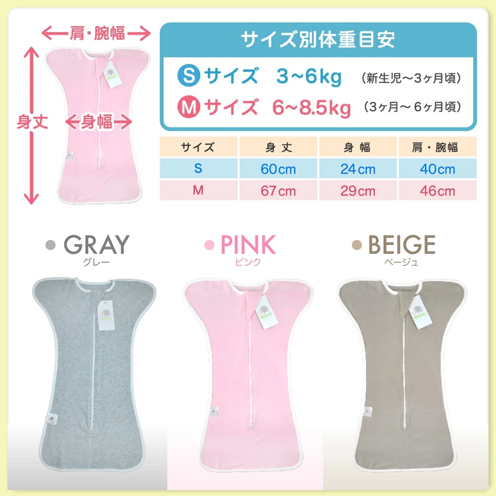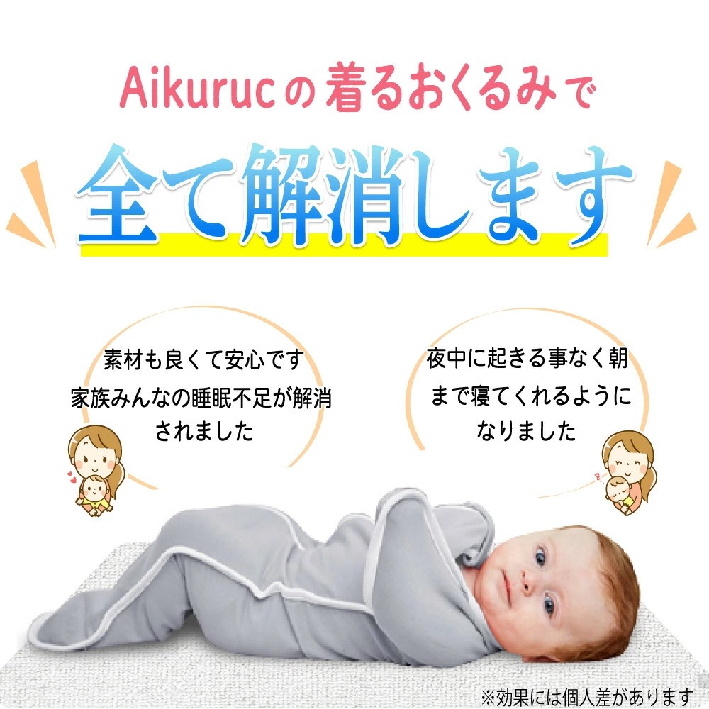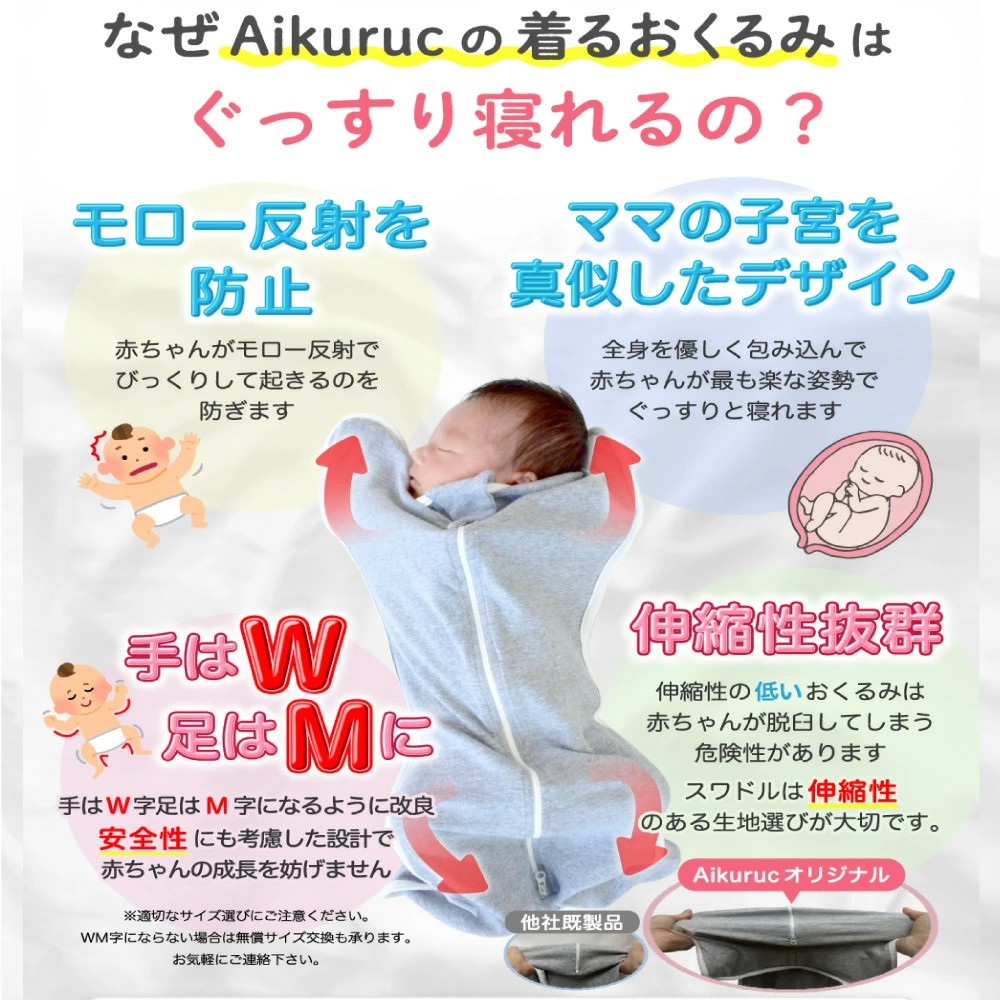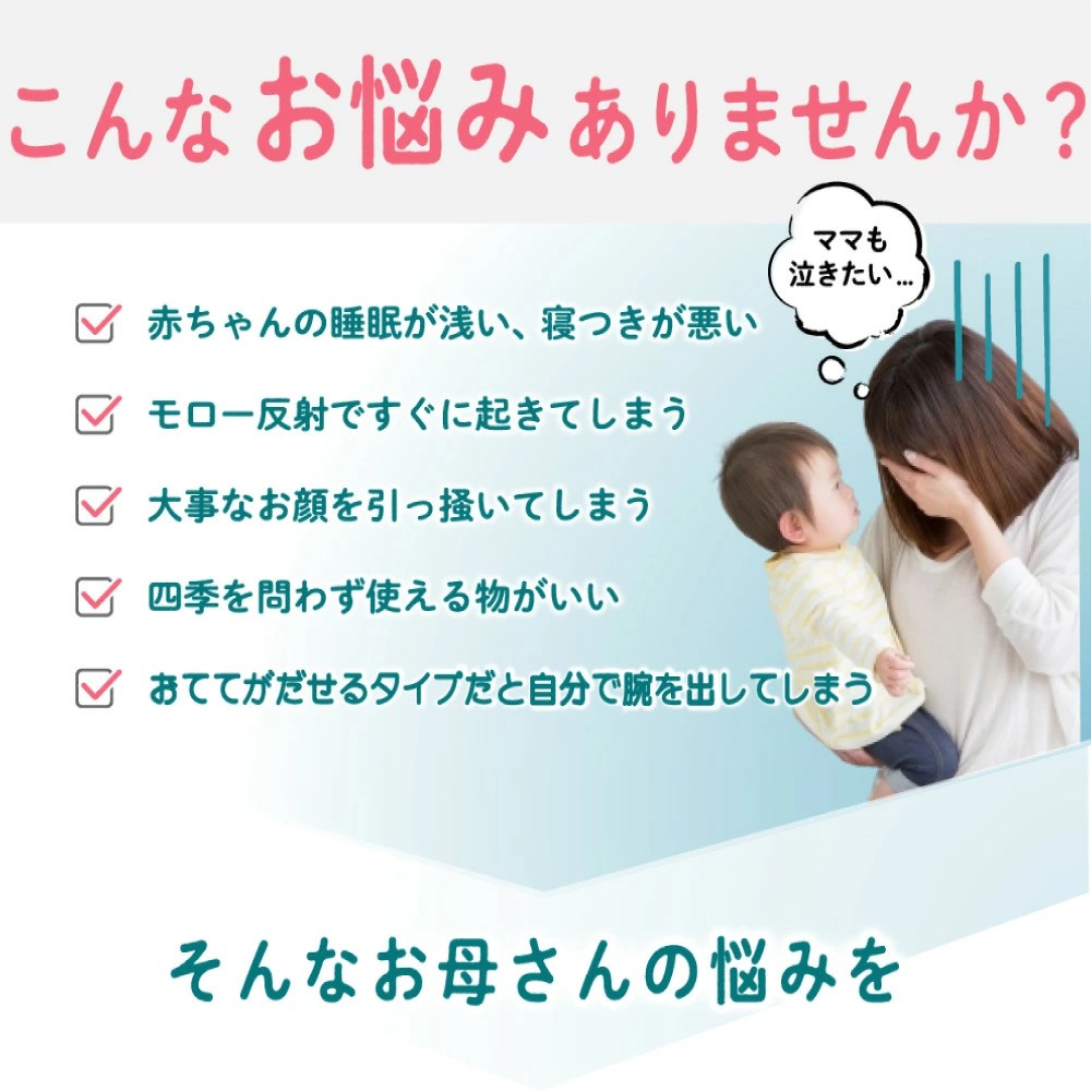【赤ちゃんに安定した睡眠を】当社の着るおくるみは赤ちゃんの睡眠を妨け?る『モロー反射』を落ち着かせる効果か?あり、新生児の良質な睡眠に役立つといわれています。ママの子宮の中の居心地を再現したデザインになっている為、全身を優しく包み込んで赤ちゃんが最も楽な姿勢でぐっすりと眠れます。